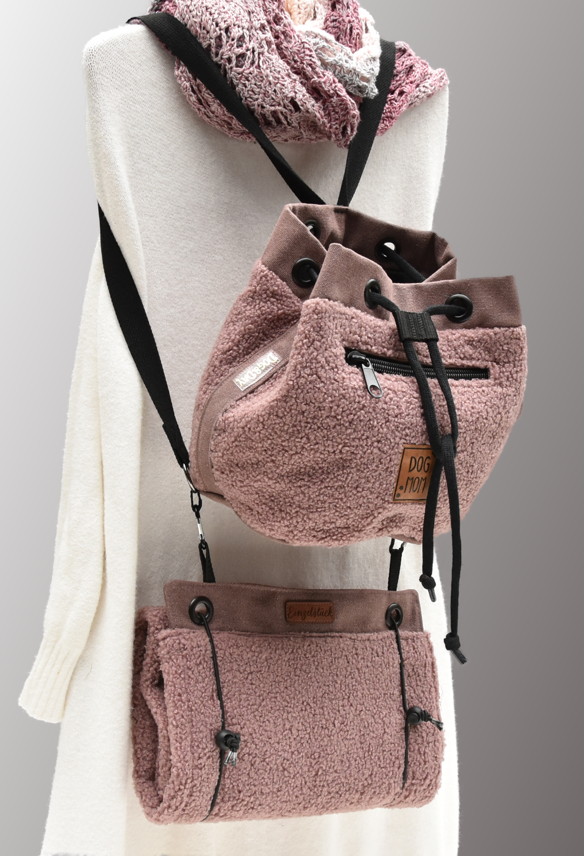 Ich verwende haltbare und funktionale Materialien wie z.B. feuchtigkeitsunabhĂ€ngige, langlebige Stoffe; wie z.B. Softshell, beschichtete Baumwolle und PlĂŒsch.Â